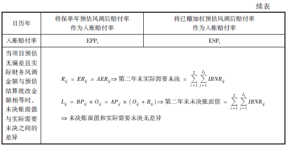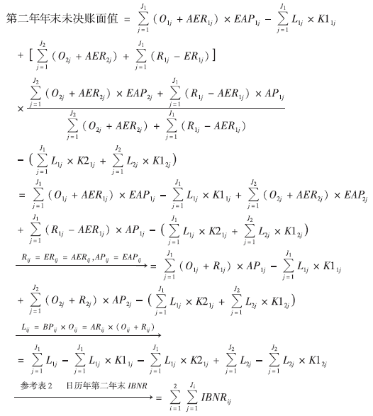推导可得第二年末实际需要未决等于日历年第二年末IBNR之和,第二年末未决账面值的推导过程如下(将保单年预估风调后赔付率作为入账赔付率的推导同理可得)。