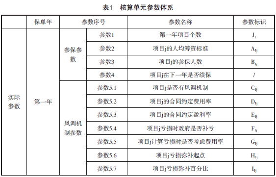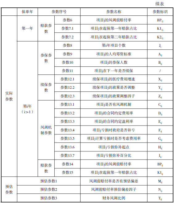 社保核算单元是由一个或多个社保项目构成的,社保项目需要多个参数进行刻画,本文将从未决赔款准备金计算的角度构建社保核算单元参数体系。社保核算单元参数包括实际参数和预估参数,实际参数反映各保单年核算单元经营社保项目个数和各个项目的真实情况,预估参数反映项目最终结算前保险公司的精算人员、项目管理人员等对该项目赔付率、结算批改金额等的预估情况。实际参数可以进一步划分为参保参数、风调机制参数、赔款参数和续保参数,预估参数可以进一步划分为项目赔付率能否准确预估、预估偏差参数和财务风调比例。由于社保项目在年度间具有一定的延续性,如续保情况、赔付情况等,在实际参数部分按照保单年分为第一年和第i年(i>1)。具体参数体系如表1所示。