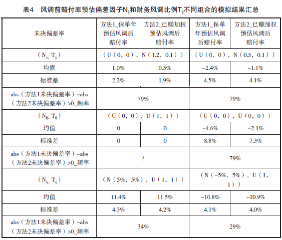 第四,不管采用何种入账赔付率确定方法,风调前赔付率预估偏差对结果的影响明显高于财务风调比例。