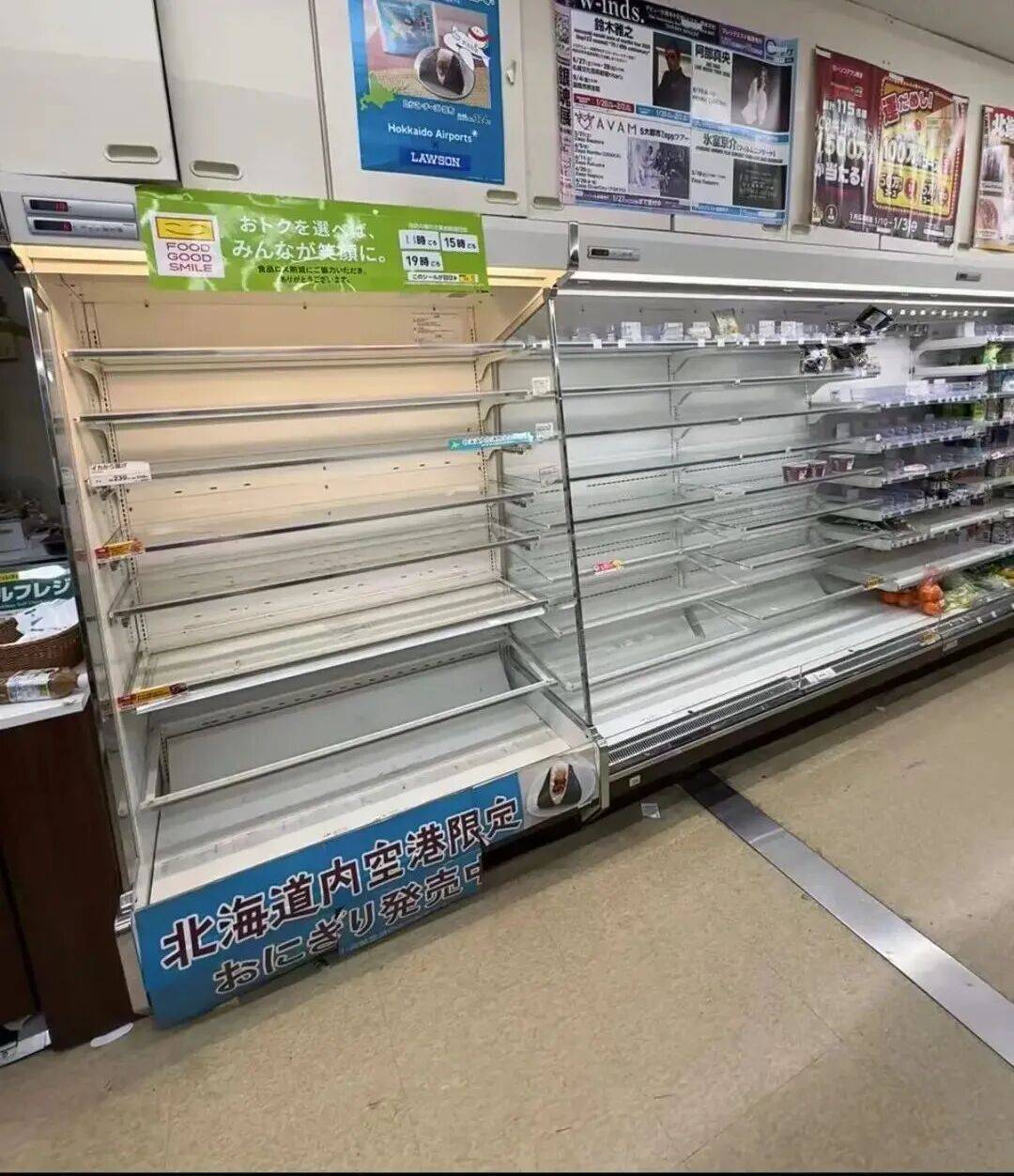 该网友表示,在机场被迫罚站等了超5个小时,跑了四次罗森便利店,只见货架被拿空。