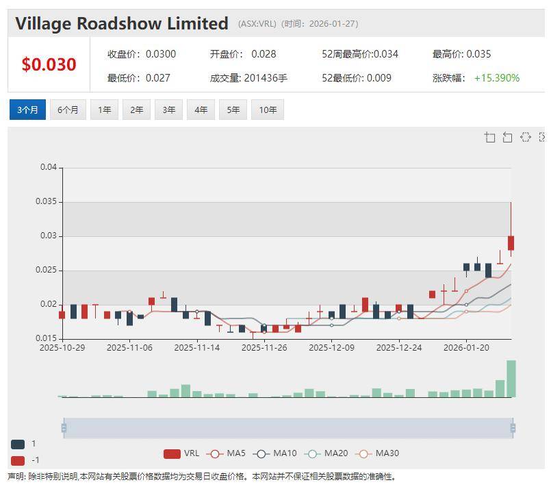 澳华财经在线数据库显示,VRL最新价0.026澳元,已发行股本4.07亿股,市值1057万澳元。
