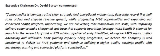 受SaaS 软件与磁脑电图(MEG)系统销售额强劲增长推动,ASX上市澳大利亚医疗科技公司Compumedics Ltd (ASX股票代码:CMP) 2026财年上半年销售订单金额达创纪录的3490万澳元,中期营收(已发货并开具发票的订单收入)亦创历史新高,达3080万澳元,同比大增32%。