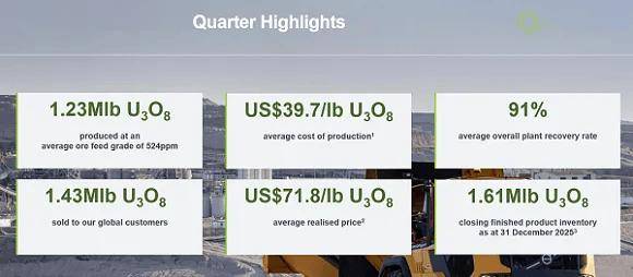 季报显示,由于入选矿石品位提高且优化加工比例,公司铀产量较上一季度增长16%,至123万磅。