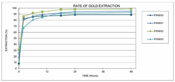 Korong矿床近地表风化层所采矿石可实现高水平且稳定的黄金回收率,主要样品24小时内平均回收率达92.75%,最新采取的高品位材料回收率可达98.1%。