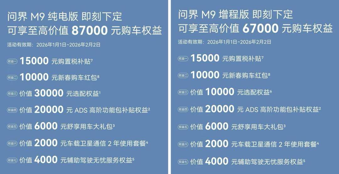 此次优惠政策表明:即日起至2月2日,下定问界M9至高可享87000元购车权益,包含购置税补贴、购车红包及ADS高阶功能包补贴等多重礼遇。这不仅是真金白银的购车优惠,更是对用户选择智慧豪华出行方式的实质性回馈,让科技豪华体验真实可感、触手可及。