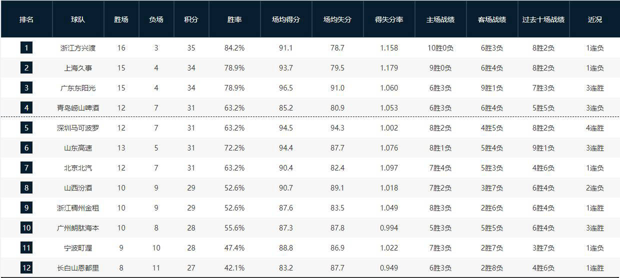 排名第七的是北京北控队,他们同样也是12胜7负。北京队困扰于频繁的球员伤病,赵睿和曾凡博刚刚伤愈复出却又再次受伤,加之主力周琦屡次缺阵,导致球队轮换阵容极其吃紧,影响了整体表现。最近以82-88落败给北控也反映出这一点。如果北京队能够维持健康状态,完全具备冲击前四强位置的潜力。