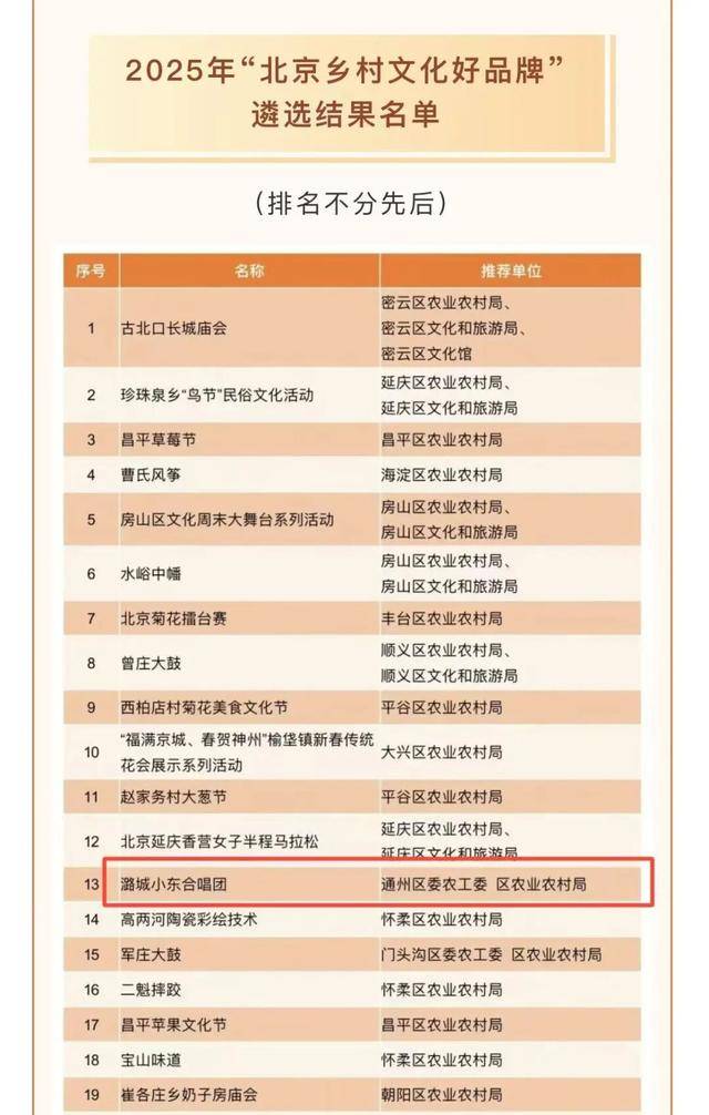 经过层层筛选与严格评审,潞城镇“小东合唱团”荣获“北京乡村文化好品牌”称号,这支由平均年龄逾六十岁的普通村民组成的团队,自2018年成立以来,始终用真挚歌声激活乡村文化活力,用艺术力量为乡村振兴赋能铸魂,生动诠释了“文艺赋美乡村”的基层实践路径。