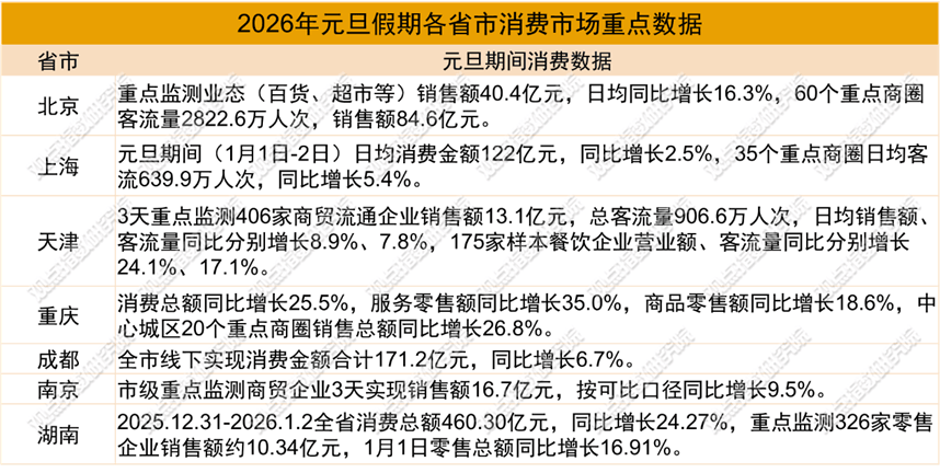 这也使得各重点省市的消费数据实现增长,元旦假期北京重点监测的百货、超市、专业专卖店、餐饮和电商等业态企业实现销售额40.4亿元,日均同比增长16.3%,60个重点商圈客流量2822.6万人次,实现销售额84.6亿元。