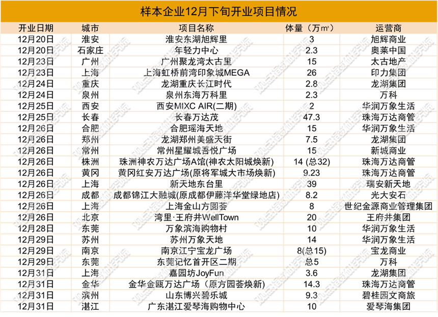 新项目入市方面,年末迎来了一波集中供应。12月下旬,以太古地产、印力集团、珠海万达商管等为代表的商业地产企业均有新项目开出,涉及广州、上海等 18 座城市。