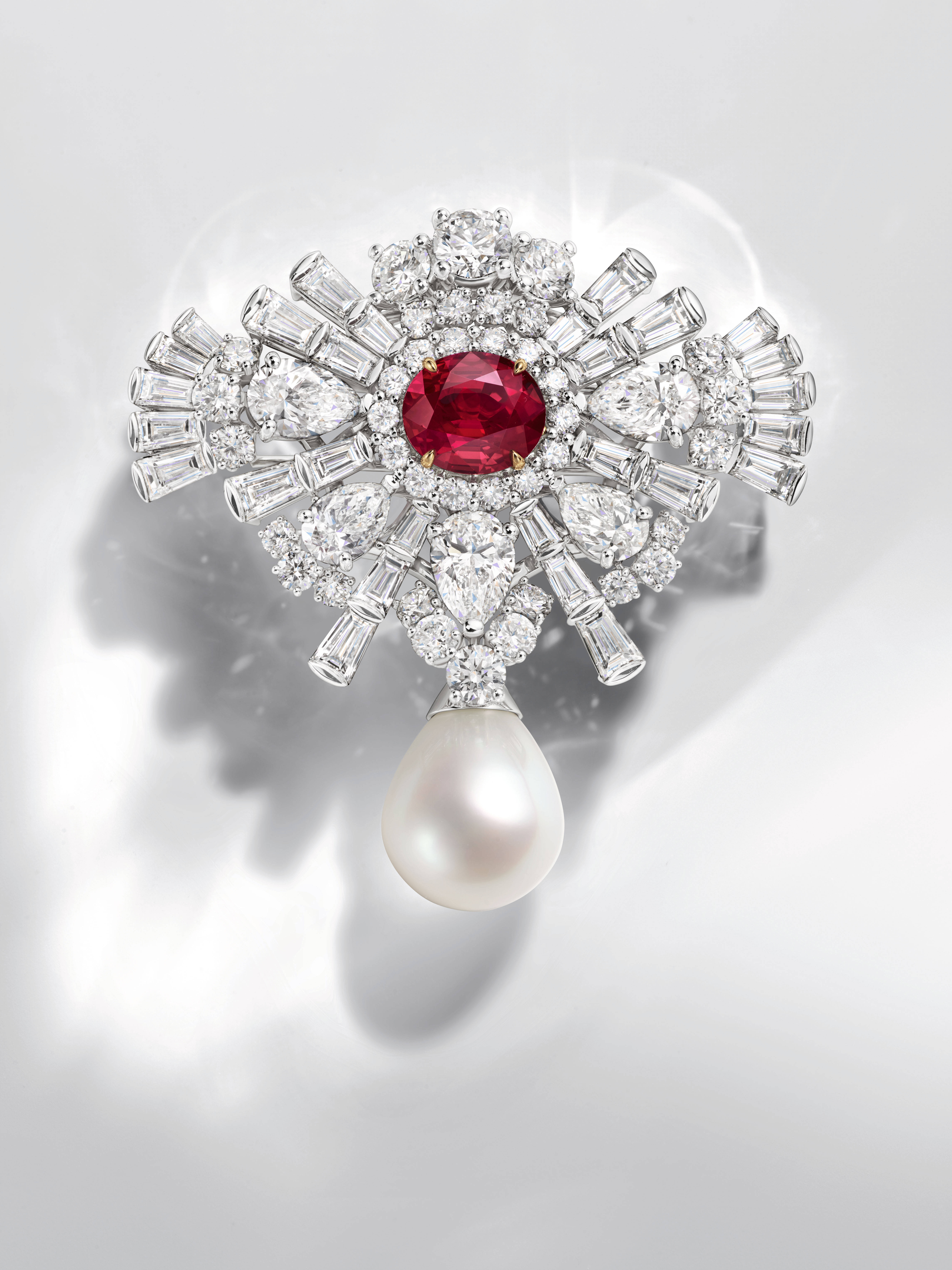 更具美学颠覆性的是红宝石、钻石和珍珠胸针。它是一场火与水的深度对话,是坚硬与温润的极致博弈。71颗混合式切工钻石呈放射状分层绽放,如同星云环绕,中心那颗重达5.01克拉的艳彩红宝石恰似恒星核心,炽热而纯粹。底部垂坠着17.08克拉的南洋白色巴洛克珍珠,以其独特的不规则轮廓打破了古典珠宝的严苛对称,珍珠柔和且带有虹彩的质感,巧妙中和了宝石的冷峻光芒。这种现代性的呈现,不仅是对传统工艺的致敬,更是对独立、灵动之个性的深情礼赞。