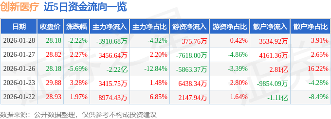 证券之星消息,截至2026年1月28日收盘,创新医疗(002173)报收于28.18元,下跌2.22%,换手率7.67%,成交量31.93万手,成交额9.05亿元。