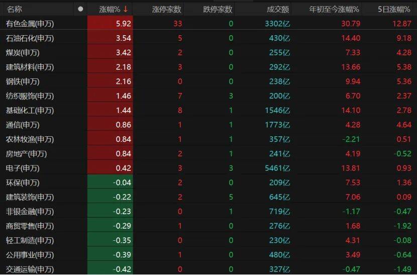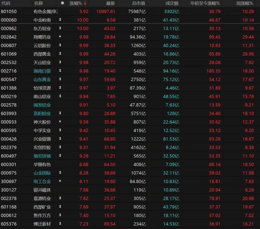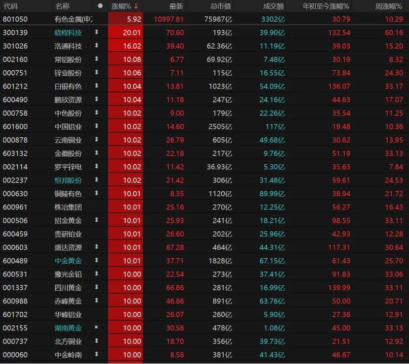 33只有色金属个股涨停,晓程科技“20cm”涨停,常铝股份、锌业股份、白银有色、鹏欣资源、中色股份、中国铝业、云南铜业、金徽股份、罗平锌电、恒邦股份、铜陵有色等个股均涨停。