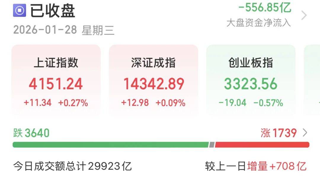 1月28日,A股三大指数涨跌不一。在有色、煤炭等资源股护盘下,沪指收红;但光伏、医药、商业航天等板块回调,创业板指收绿。市场亏钱效应明显,共计3640只个股收跌。