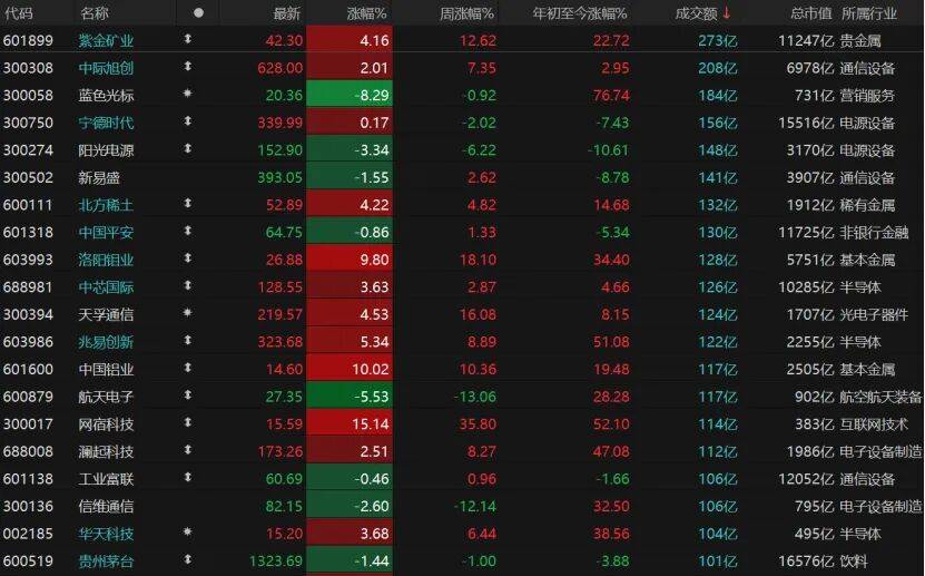 量价温和,但亏钱效应显著。当日3640只个股收跌,跌停股28只;1739只个股收涨,涨停股84只。成交额超百亿元的个股达20只,紫金矿业居首,收涨4.16%报42.3元/股。