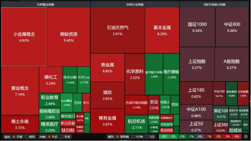 盘面上,小金属概念、稀缺资源、磷化工、黄金概念、稀土永磁等资源股大涨,科技股波动较大,航空航天装备、医疗器械、机器人等下跌。
