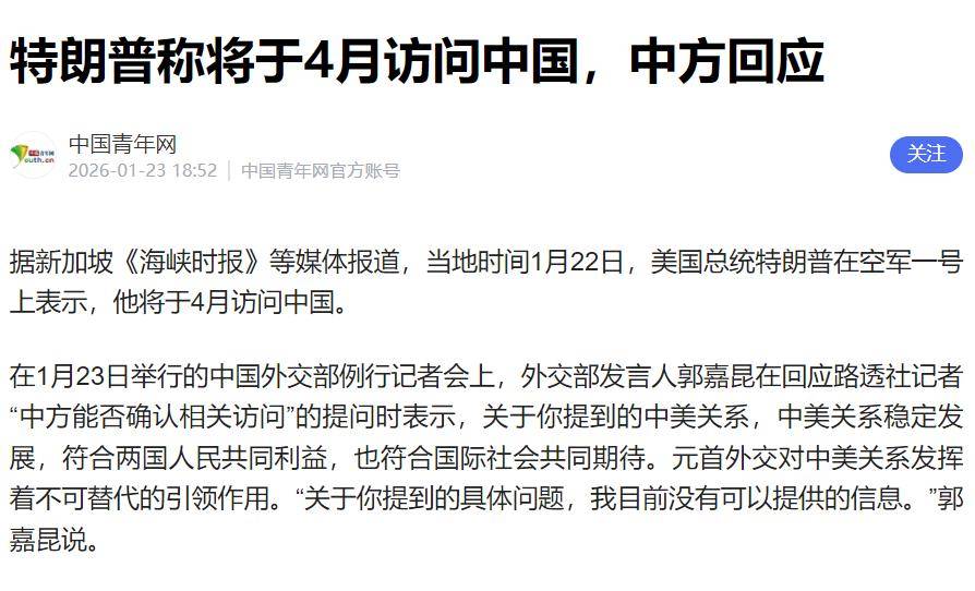 特朗普这次放出访华的消息,实际上是他惯常的一种外交手段——先放风、再逼宫。然而,遗憾的是,对于中国来说,这一招早已不再管用。1月22日,特朗普高调宣布他计划在今年4月访问中国,但中方的回应却冷淡至极,只简洁地表示:我目前没有可以提供的信息。这句话,虽然简短,却态度明确,语气坚决,没有任何回旋余地。这并非只是外交辞令,而是中国在表达一种战略上的姿态。那么,面对这样的回应,难道中美之间还真的有必要继续谈下去吗?