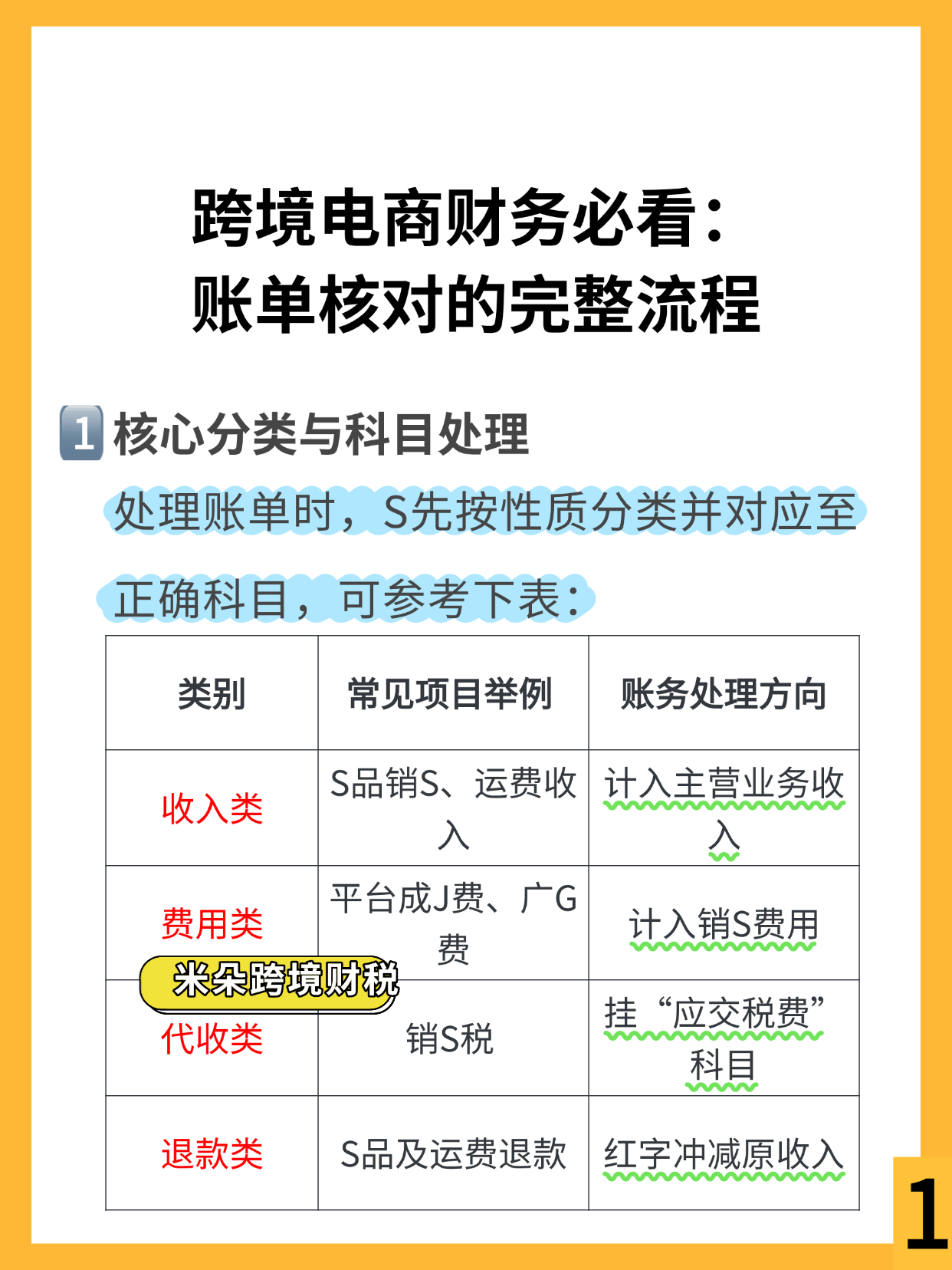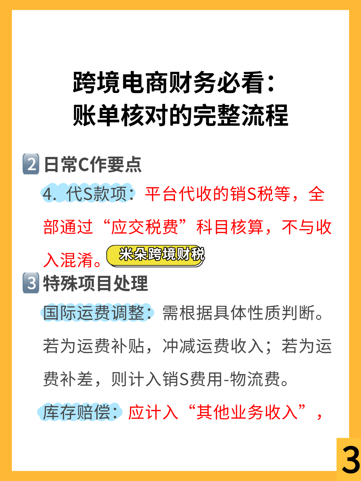 二、日常C作要点 1.逐项核对:建议逐行核对账单项目,可使用颜色标记辅助分类(如收入标绿、费用标红)。 2.科目设置:收入和费用科目应设置明细,例如收入细分S品、运费;费用细分成J费、仓储费、广G费等。 3.退款处理:所有退款均采用红字冲减原收入科目,不直接计入费用。
