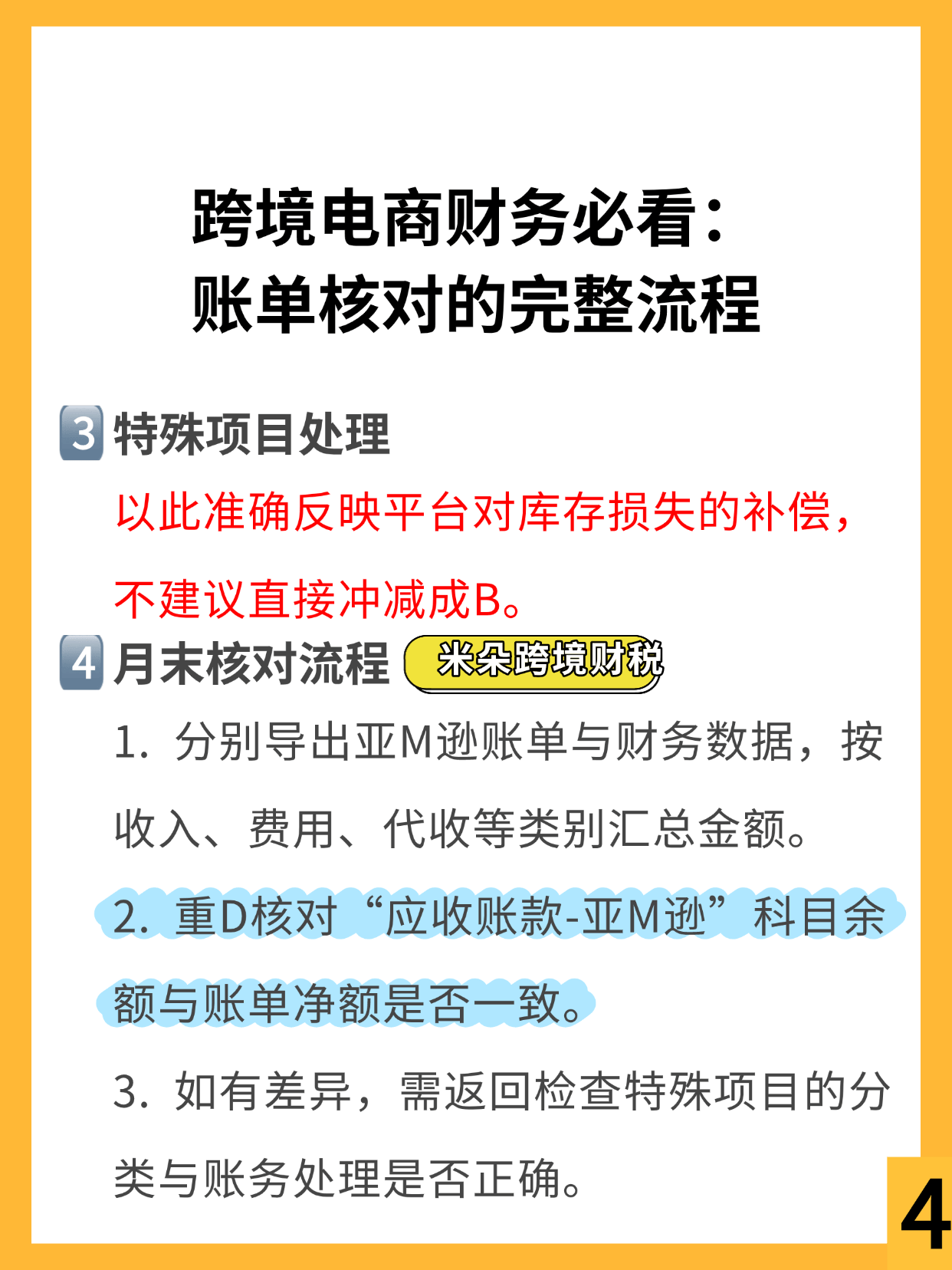 库存赔偿:应计入“其他业务收入”,以此准确反映平台对库存损失的补偿,不建议直接冲减成B。 四、月末核对流程 1.分别导出亚M逊账单与财务数据,按收入、费用、代收等类别汇总金额。 2.重D核对“应收账款-亚M逊”科目余额与账单净额是否一致。 3.如有差异,需返回检查特殊项目的分类与账务处理是否正确。