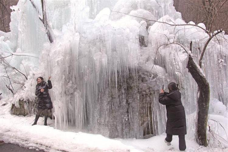 在陕西太白山国家森林公园,雪后的莲花峰瀑布凝结成壮观的冰挂。冰柱、冰幔层层叠叠,在阳光照射下愈发晶莹剔透,引得游客纷纷驻足拍照。