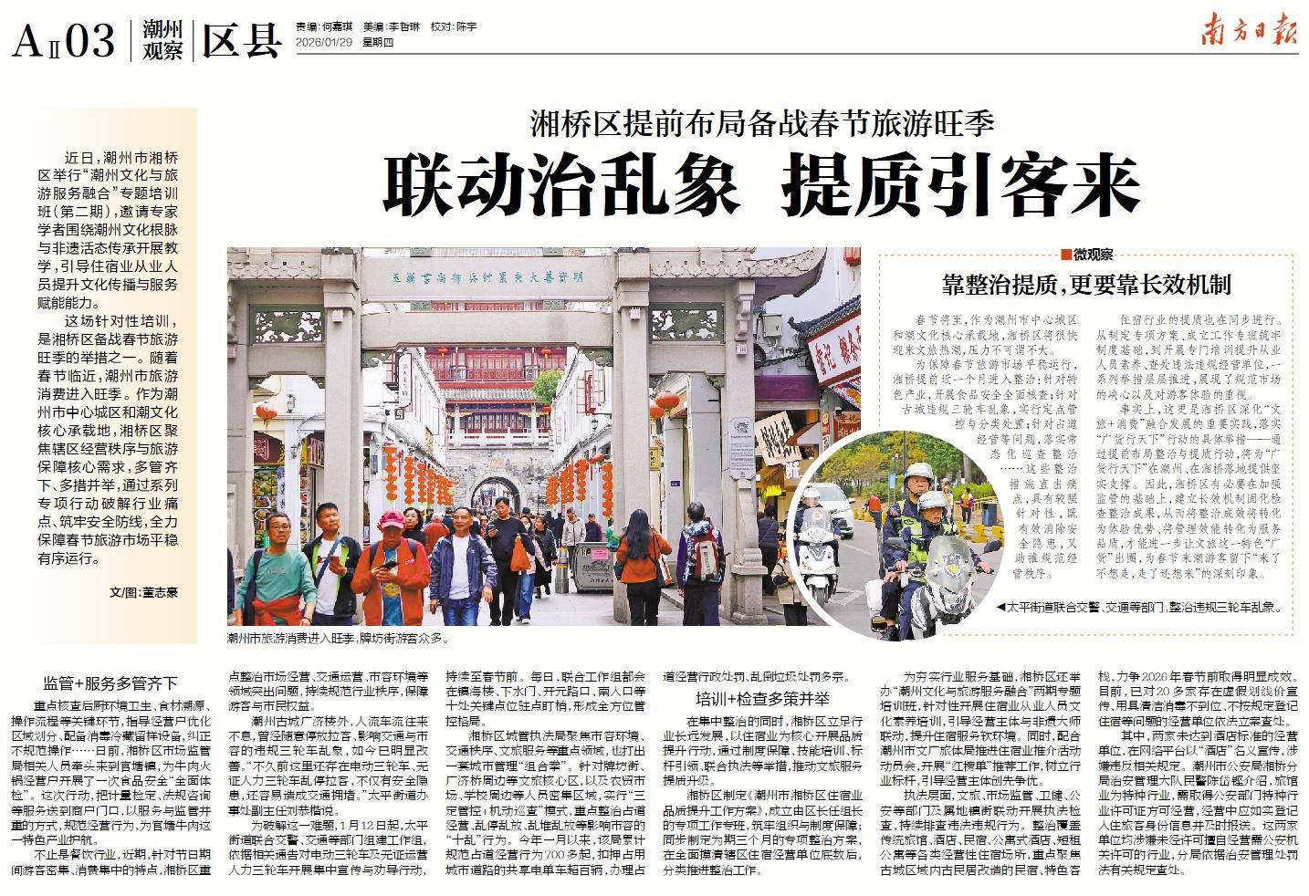 为保障春节旅游市场平稳运行,湘桥提前近一个月进入整治:针对特色产业,开展食品安全全面核查;针对古城违规三轮车乱象,实行定点管控与分类处置;针对占道经营等问题,落实常态化巡查整治……这些整治措施直击痛点,具有较强针对性,既有效消除安全隐患,又助推规范经营秩序。