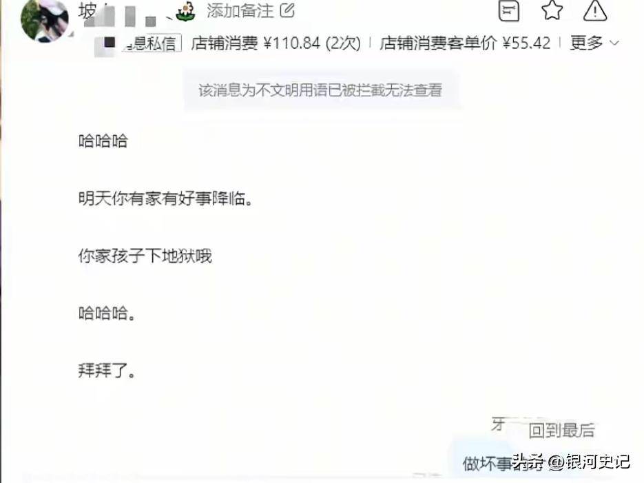 深夜一点到三点,王某密集发送百字污言秽语,专挑最恶毒的话术攻击商家,核心诅咒直指商家孩子,那句“你孩子下地狱死了没”,让身为宝妈的商家崩溃落泪。