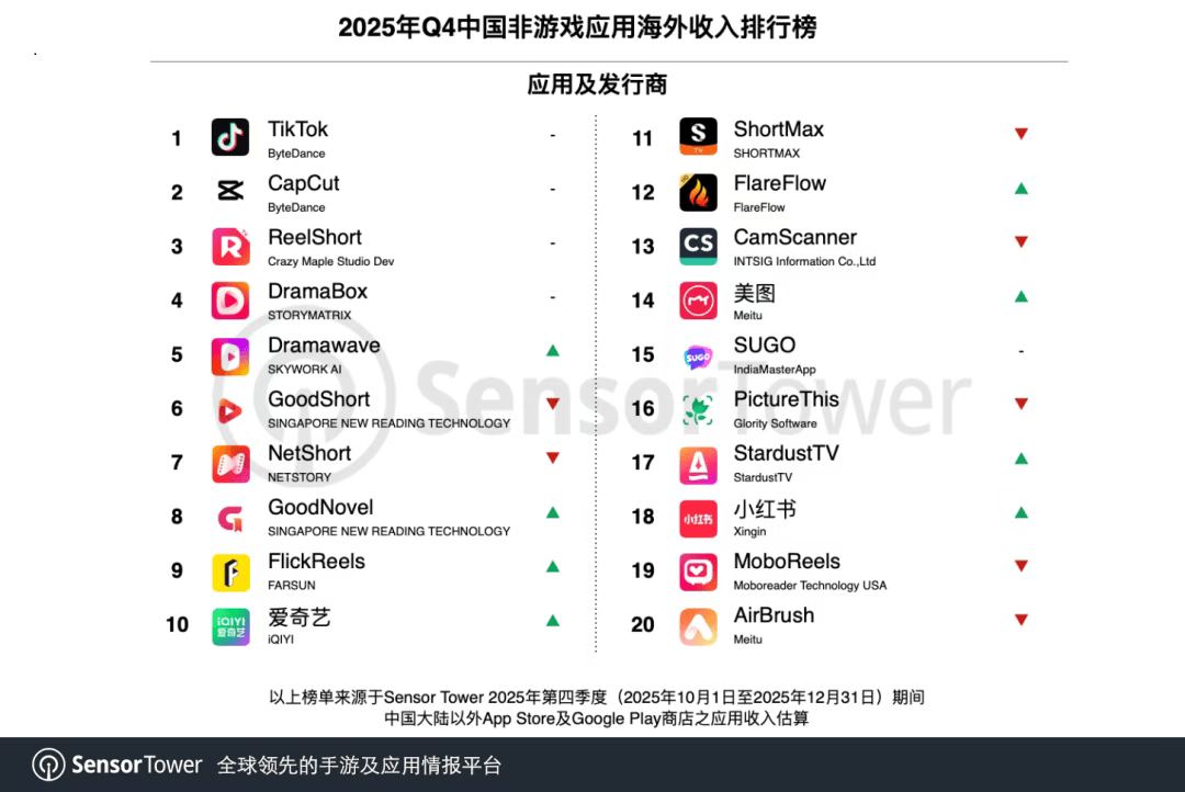 1月14日,2025年Q4中国非游戏应用海外收入排行榜发布,字节跳动、美图、小红书等公司旗下产品登榜,美图秀秀(Meitu)、AirBrush进入TOP 20。