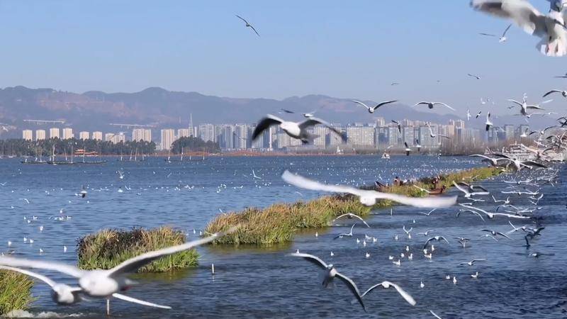 每到冬季,在云南省昆明市滇池畔的海埂大坝、海洪湿地等地,红嘴鸥成群结队在空中翩翩起舞,成为春城昆明的一道靓丽风景。