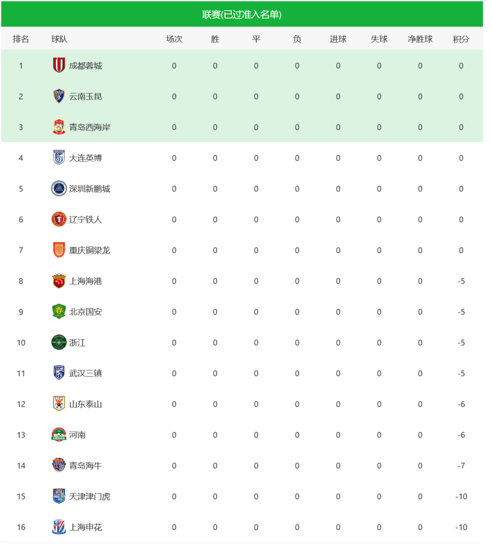 原创 中超积分榜:申花津门虎-10分垫底,长春亚泰中甲-4分垫底