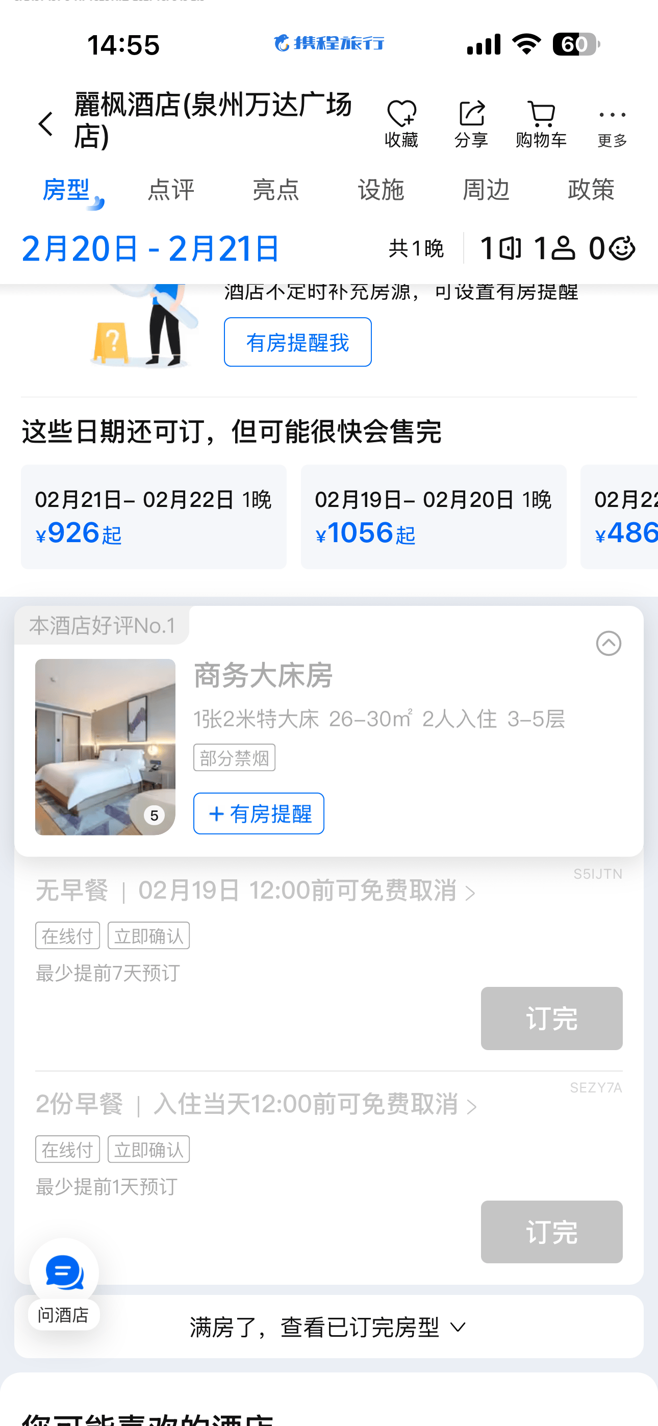 泉州麗枫酒店个别日期已显示售罄。网页截图