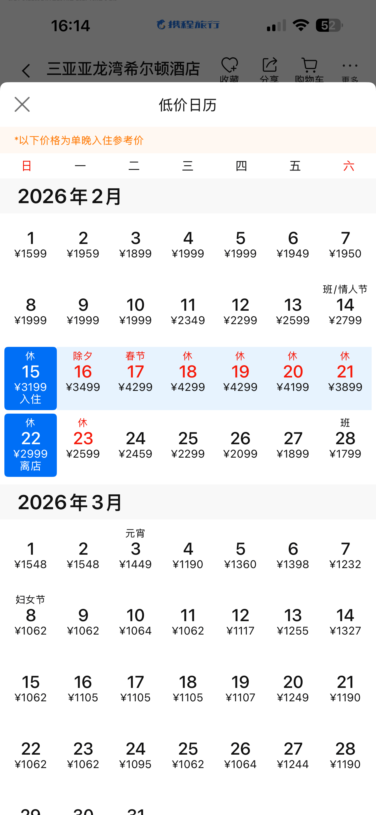 作为传统旅游热门目的地的三亚,酒店在春节期间同样价格上涨。记者查询发现,2月15日至23日期间,三亚珊瑚湾文华东方酒店园景大床房最低价格约6100元/晚,部分房型已售完,较平日约2000元/晚的价格涨幅明显。三亚亚龙湾希尔顿酒店也出现大幅涨价,工作人员表示,冬季是三亚旅游旺季,北方游客前来过冬的现象普遍,气候优势和假期需求共同推高了酒店价格。