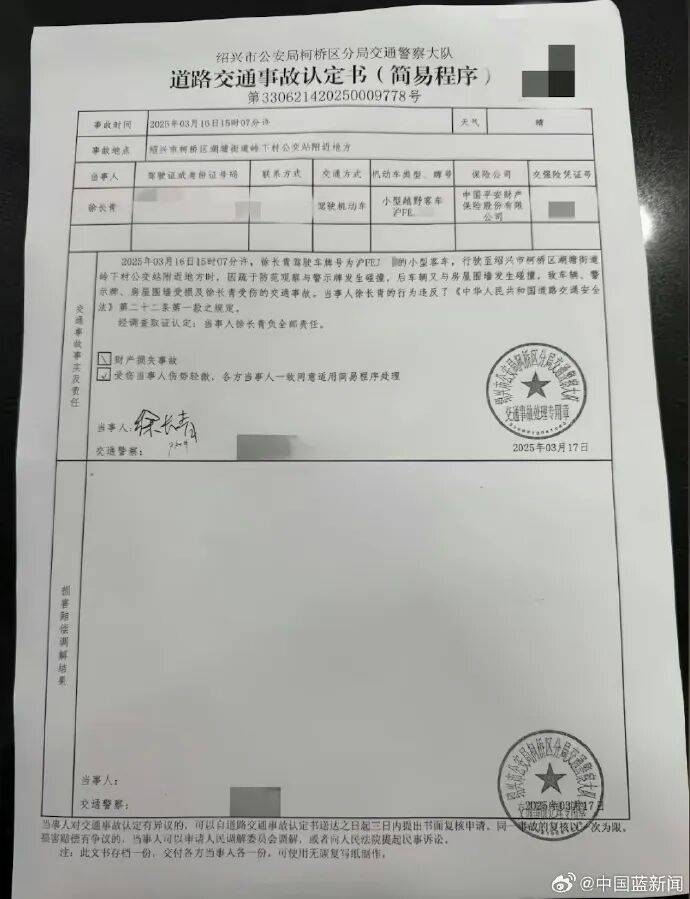 1月29日,记者就此事联系绍兴122,得知事发地点“柯桥区湖塘街道岭下村”属于绍兴交警柯南中队管辖范围。记者联系了绍兴交警柯南中队,交警回复:“这起事故是去年发生在他们辖区的,网络上流传的道路交通事故认定书是属实的,目前正在调查中。”