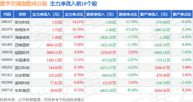 资金流向方面,数字交通(980075)指数成份股当日主力资金净流出合计25.51亿元,游资资金净流入合计8.64亿元,散户资金净流入合计16.87亿元。成份股资金流向详情见下表:
