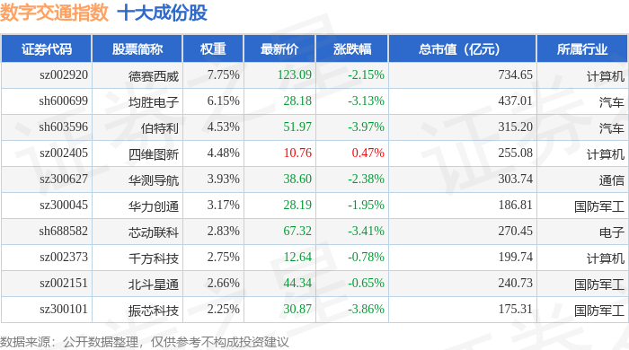 证券之星消息,1月29日,数字交通(980075)指数报收于3609.6点,跌1.92%,成交441.14亿元,换手率2.97%。当日该指数成份股中,上涨的有6家,锐明技术以10.01%的涨幅领涨,下跌的有43家,电科芯片以6.55%的跌幅领跌。