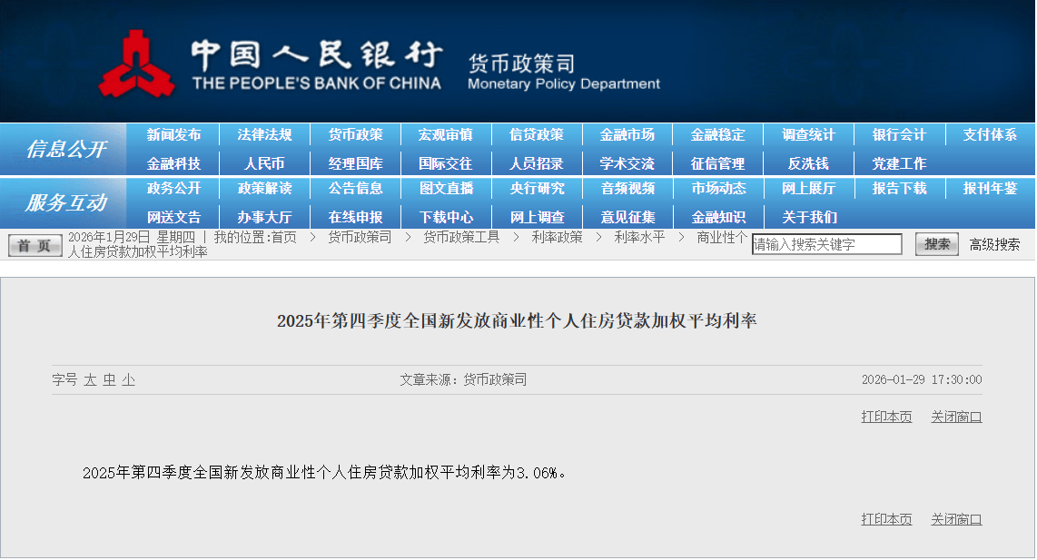 据中国人民银行1月29日消息,2025年第四季度全国新发放商业性个人住房贷款加权平均利率为3.06%。