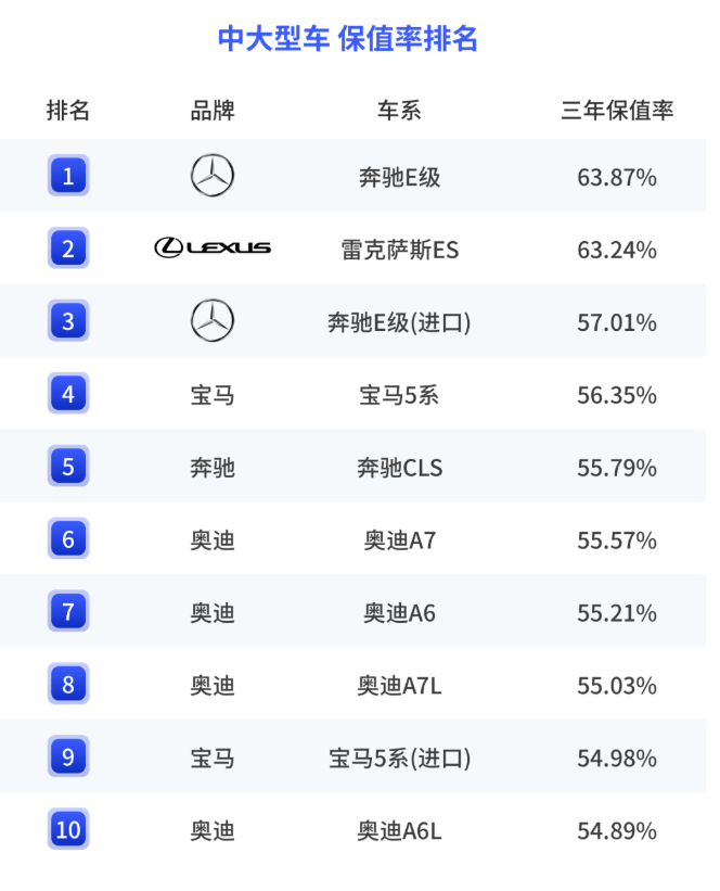 中大型车保值率排名中,奔驰E级当仁不让排名第一,第二是雷克萨斯ES、第三是进口E级。主要原因是奔驰并没有回应宝马的价格战,甚至是回调了优惠力度,E级这样的车型终端优惠力度并没有此前那么高,且即便这样卖的也很好,新车价格坚挺销量好,那保值率自然差不了。雷克萨斯ES不必多说,保值率一直很高。至于奥迪A6L,是56E中保值率最低的,主要与终端行情有直接关系。