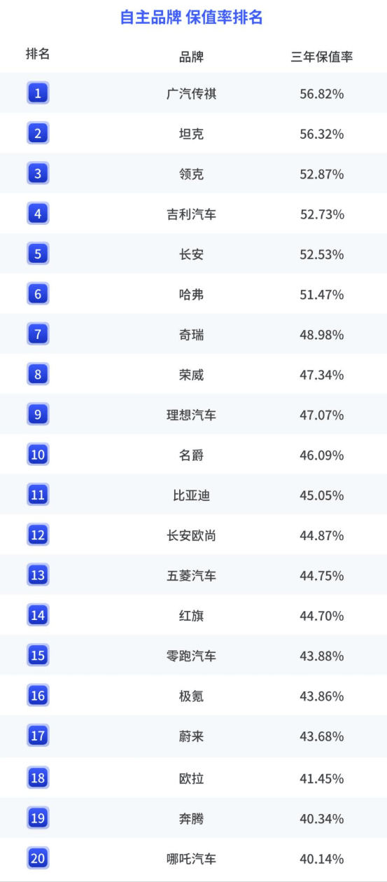 咱们按品牌来看,自主品牌的三年保值率排名中,前三名分别是广汽传祺、坦克和领克。第一名大家想到了吗?传祺这两年曝光较弱,销量相比此前也有所下滑,但保值率却很高,是M8、M6、E8、E9这些MPV提高了数据吗?咱可以评论区聊聊。值得一提的是,新势力品牌中,理想排第一,有点当仁不让的意思。