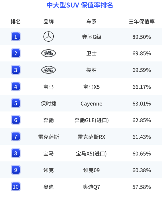 来到中大型SUV三年保值率这边,能够看出依旧是传统豪华品牌的天下。大G、卫士、揽胜、X5依旧是硬通货,说到底是买的贵、卖的也贵,市场的认可度还是相当高的。