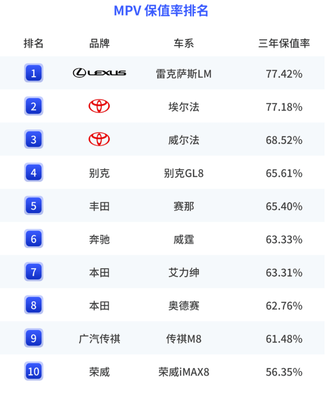 MPV保值率方面,雷克萨斯LM、埃尔法、 威尔法保值率依旧感人,尽管中国品牌的攻势很猛,但现阶段还是很难取代它们的位置。自主品牌这边,传祺M8当仁不让,依旧是国产MPV中保值率最高的,而这也给传祺整个品牌的保值率加了分,下面的数据会有所验证。