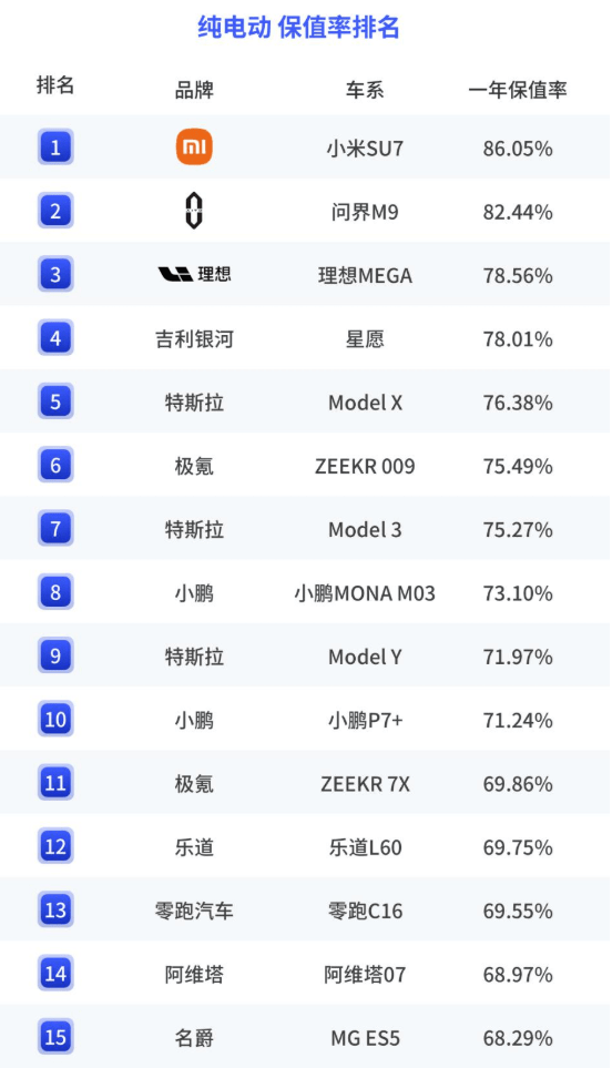 在纯电动车保值率排名中,小米 SU7 以一年保值率 86.05% 位居榜首。紧随其后的是问界 M9 与理想 MEGA,保值率分别为 82.44% 与 78.56%。SU7的畅销以及新车的排队交付,也让它的二手车保值率变高。问界M9不用多说,作为50万级车型,一直热销,保值率自然不错。而理想MEGA首先是车价比较贵,购置税较高,产品力很强,准新车的关注度高,二手车价格就坚挺。