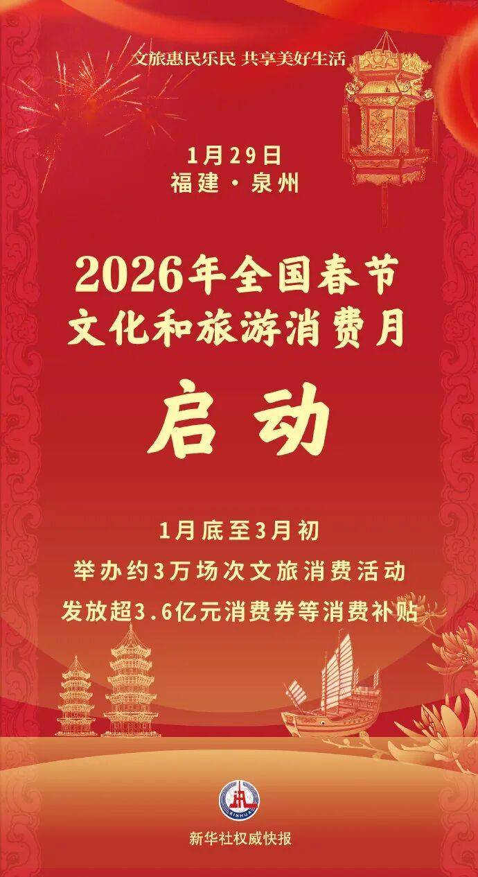 1月29日,文化和旅游部在福建省泉州市正式启动2026年全国春节文化和旅游消费月,组织各地围绕春节假期开展文旅消费惠民活动,更好满足人民群众“欢欢喜喜过大年”美好生活需要。