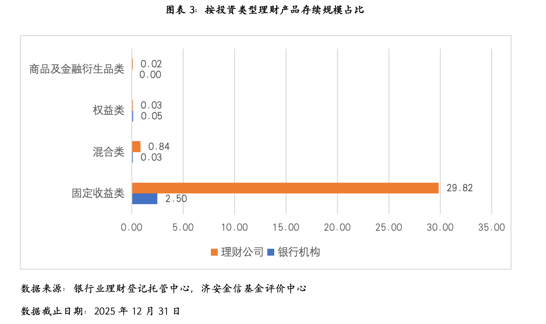 截至2025年末,固定收益类产品存续规模为32.32万亿元,占全部理财产品存续规模的比例达97.09%,较去年同期减少0.24个百分点;混合类产品存续规模为0.87万亿元,占比为2.61%,较去年同期增加0.17个百分点;权益类产品和商品及金融衍生品类产品的存续规模相对较小,分别为0.08万亿元和0.02万亿。