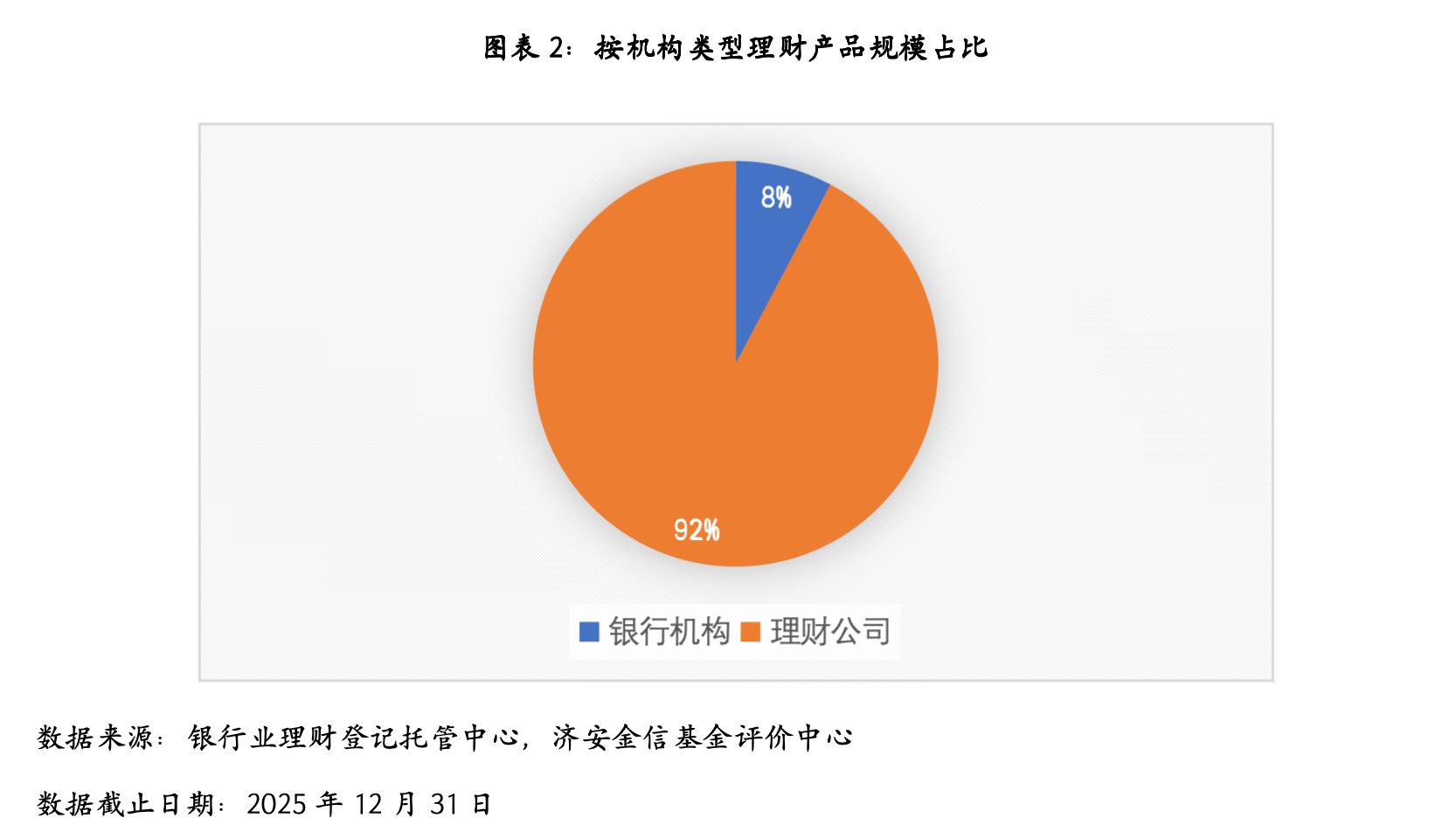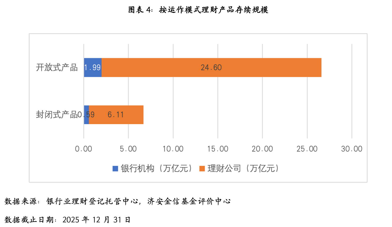 分机构类型来看,截至2025年末,银行机构存续产品1.26万只,存续规模2.58万亿元,同比减少29.12%;理财公司存续产品3.37万只,存续规模30.71万亿元,同比增加16.72%,占全市场的比例达到92.25%。