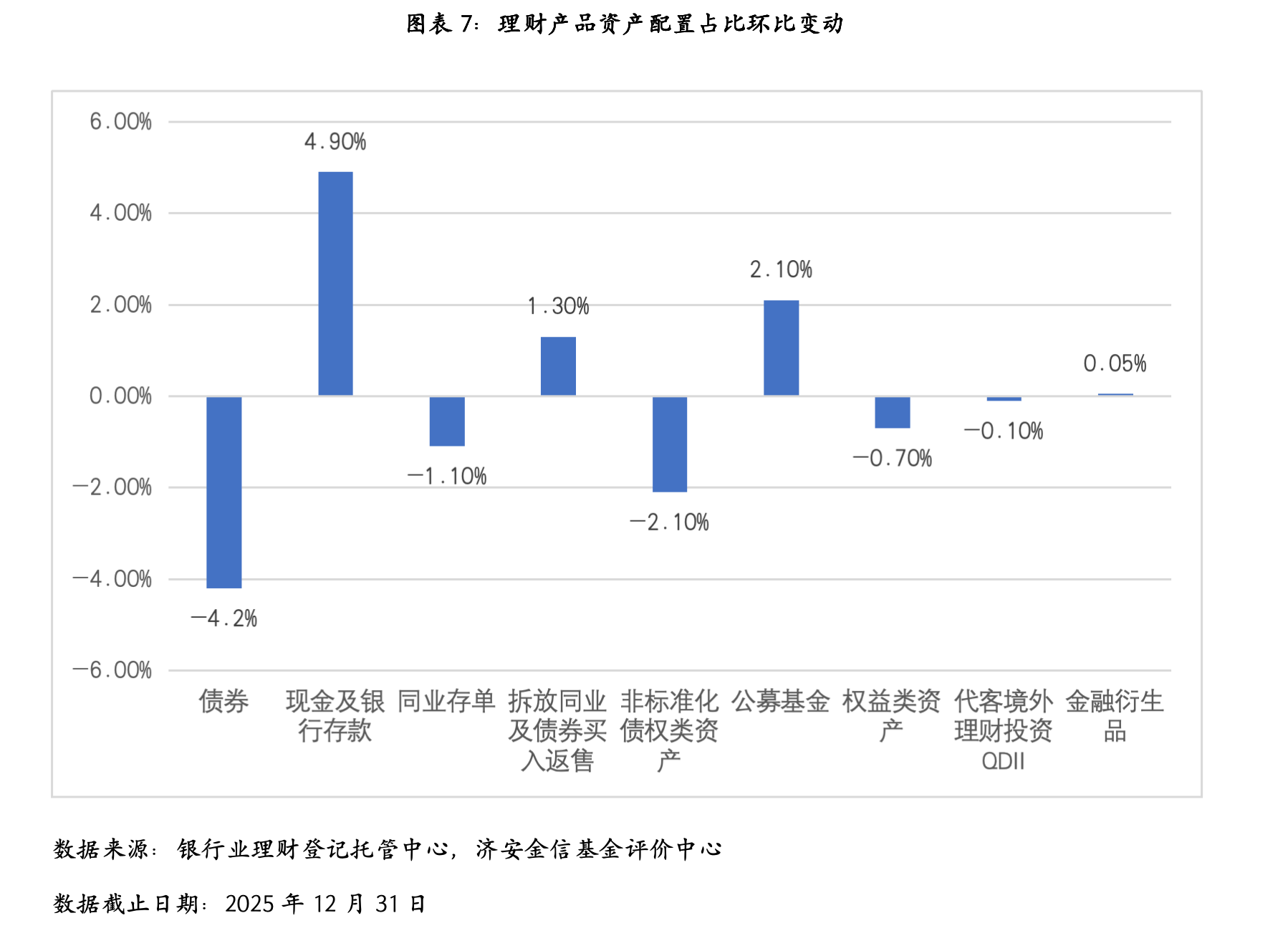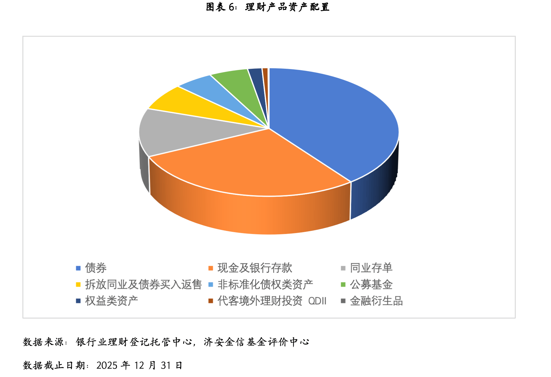 截至2025年末,理财产品资产配置以固收类为主,主要投向债券、现金及银行存款、同业存单、拆放同业及债券买入返售、非标准化债权类资产和公募基金,分别占总投资资产的39.7%、28.2%、12.2%、6.9%、5.1%、5.1%。