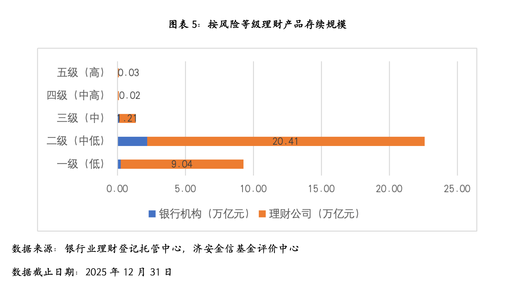 截至2025年末,风险等级为二级(中低)及以下的理财产品存续规模为31.87万亿元,占全部理财产品存续规模的比例为95.73%;风险等级为四级(中高)及以上的理财产品存续规模为0.08万亿元,占全部理财产品存续规模的比例为0.24%。
