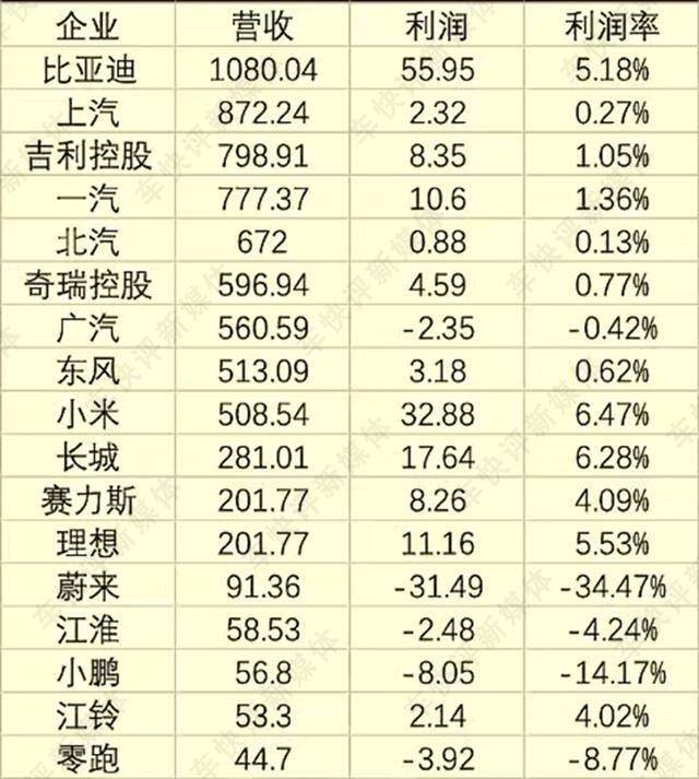 除了上述两个原因,汽车行业产能过剩,对车市健康有序的发展也会起到一定的负面作用。下图是国内主要车企的营收和利润对比,感兴趣可以自己研究一下。