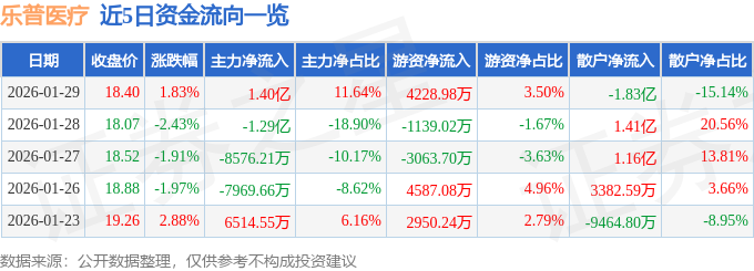 证券之星消息,截至2026年1月29日收盘,乐普医疗(300003)报收于18.4元,上涨1.83%,换手率4.12%,成交量65.0万手,成交额12.07亿元。