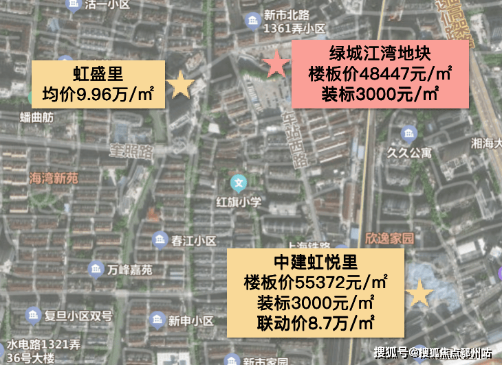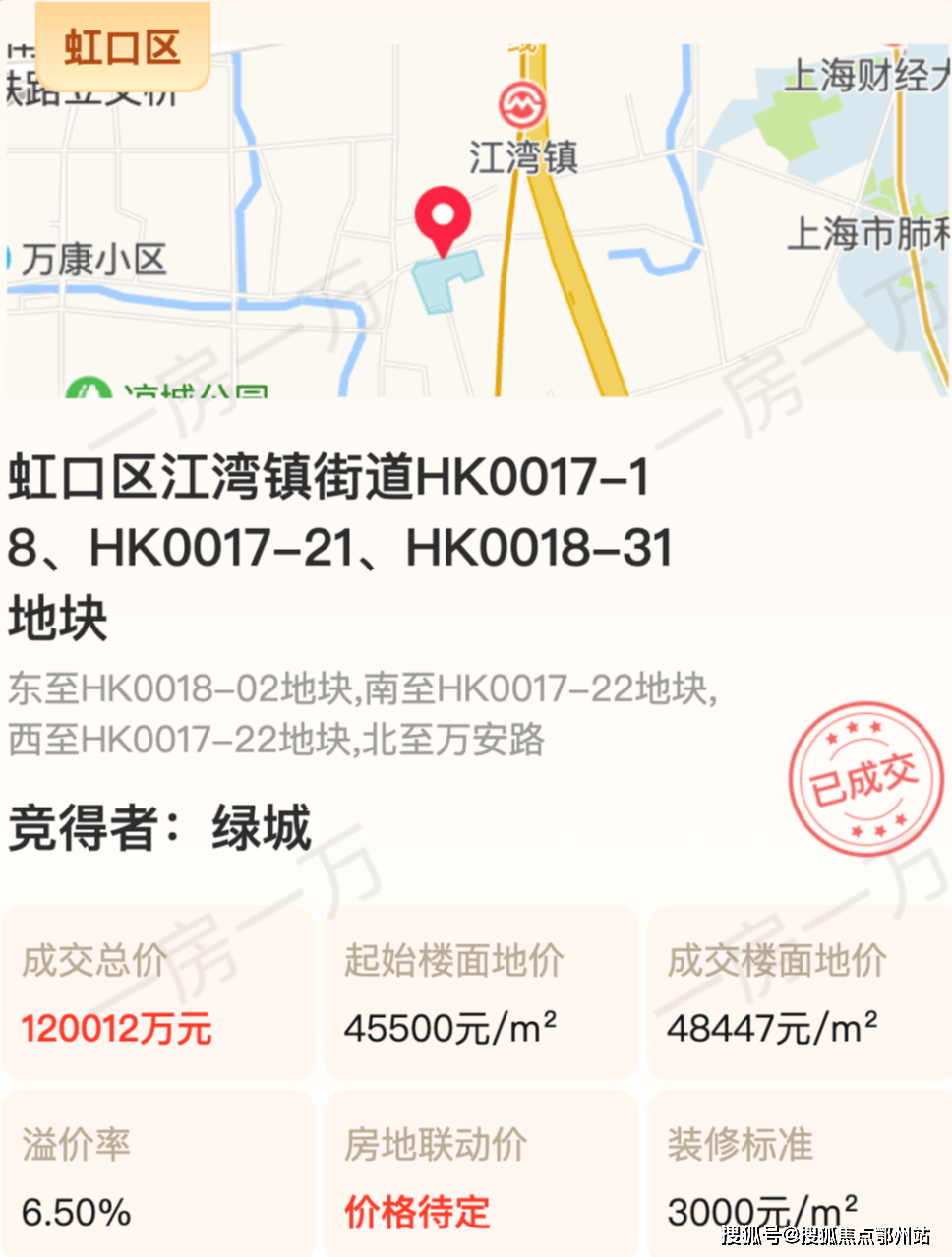 其中,虹口江湾地块容积率2.25-2.5,溢价率6.48%,楼板价48447元/㎡,装修标准不低于3000元/㎡。