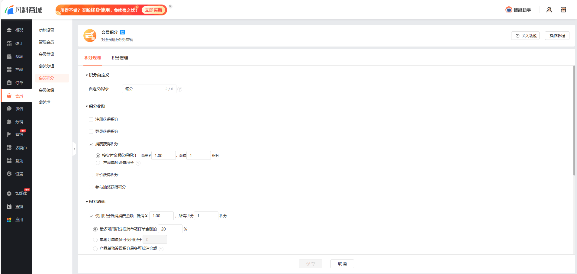 凡科商城的会员积分功能,解决了传统会员积分留存难的困境,大大提升了复购率。