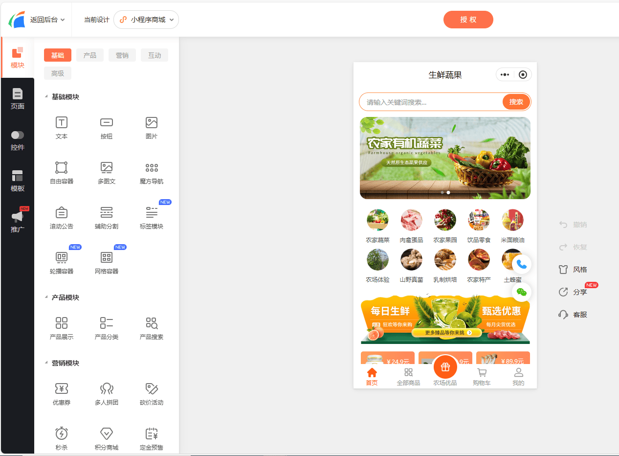 接下来,我们可以对模板进行拖拽式编辑,自由添加或删除模块与控件。