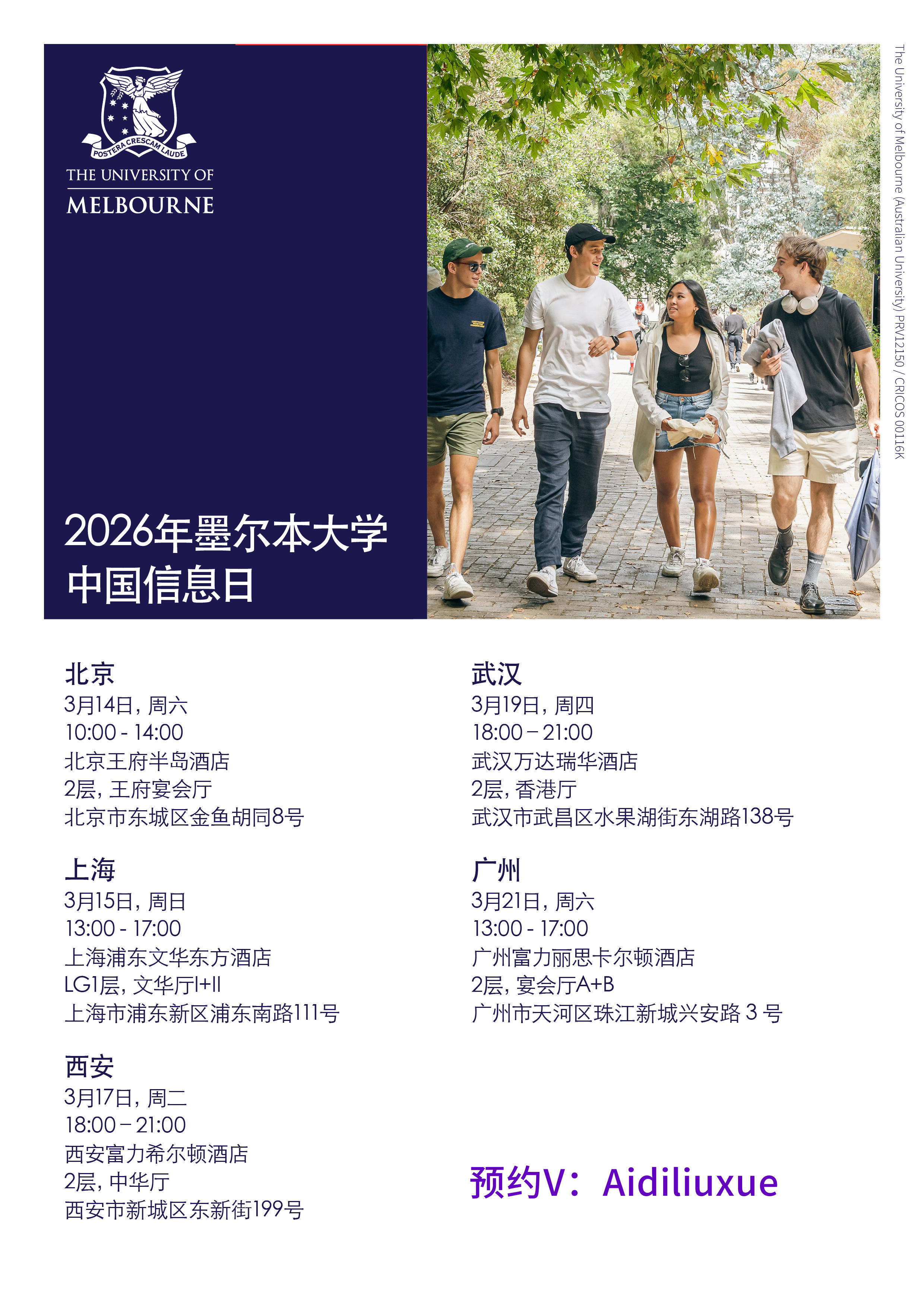 想了解更多更详细的墨大申请,可以了解下: 3月14日-3月21日,墨尔本大学将在北京、上海、西安、武汉、广州举办2026年墨尔本大学中国信息日招生系列活动。 墨尔本大学全校九大学院的重磅教授及招生官、学生事务部、国际录取部、预科圣三一学院、中国办公室都将出席此次招生见面会; 预备申请墨大,或者对墨大预科、本科、硕士、博士感兴趣的同学们都可以约!已经获得墨大offer的也可以提前了解真实的墨大。
